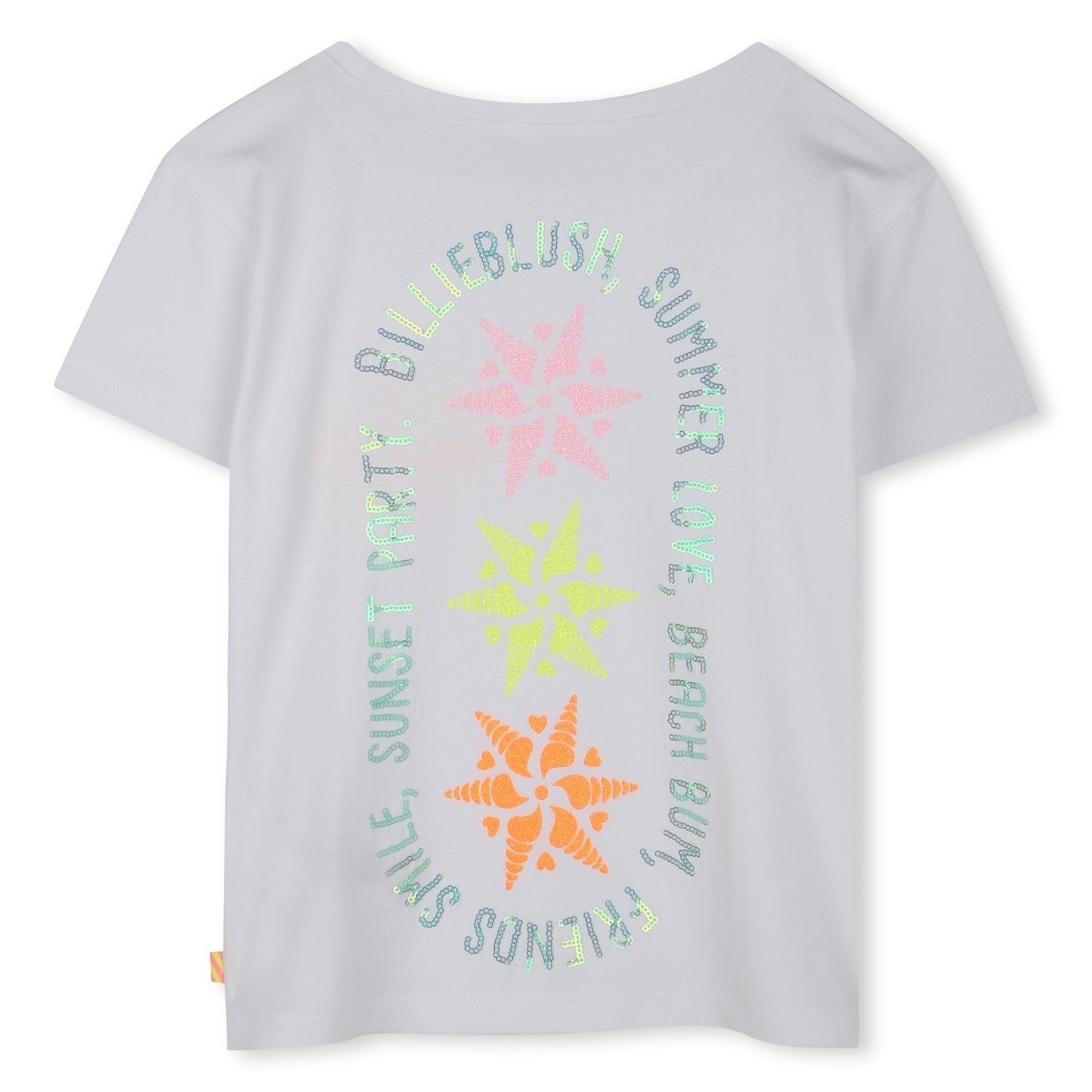 This white cotton short sleeve tshirt by Billieblush features colorful graphic designs and sequin text that reads Billieblush summer love, beach bum, friends smile, sunset party.