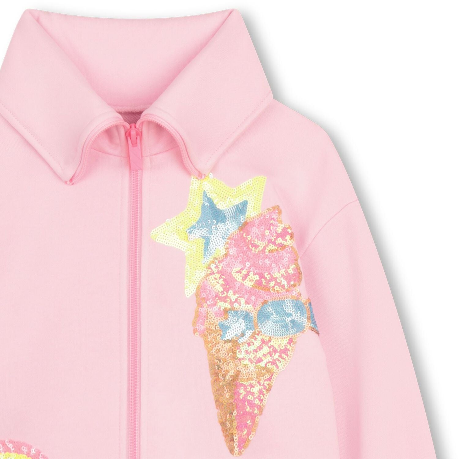 Pink zip-up top for girls by BILLIEBLUSH. Made from soft cotton jersey, it features neon green ribbed trims and a foldable stand-up collar. The front is decorated with sequined ice cream, rainbow, and heart motifs, and it fastens with a chunky neon pink zip for easy dressing.