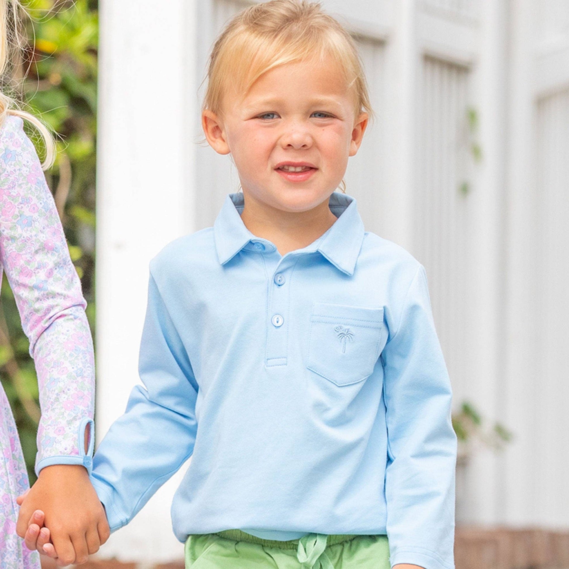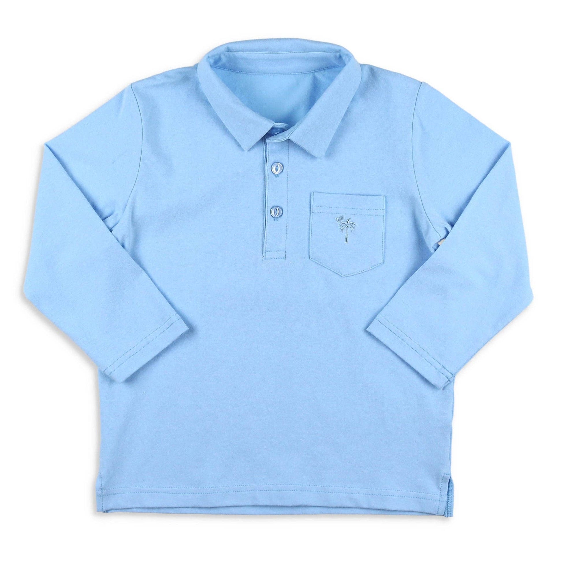 Your kids will feel the peacefulness in this comfortable Boys Polo in Blue Lagoon and it will become indispensable for those cooler days. This boys classic, soft ocean blue, polo by Serendipity will be a wanted addition for any fall or winter adventure, especially for school activities. The collar, the three custom front buttons, and the palmetto tree and shrimp moon logo on the front just increases the desirability of this traditional shirt. The soft and comfortable fabric makes it the perfect accessory for his wardrobe.