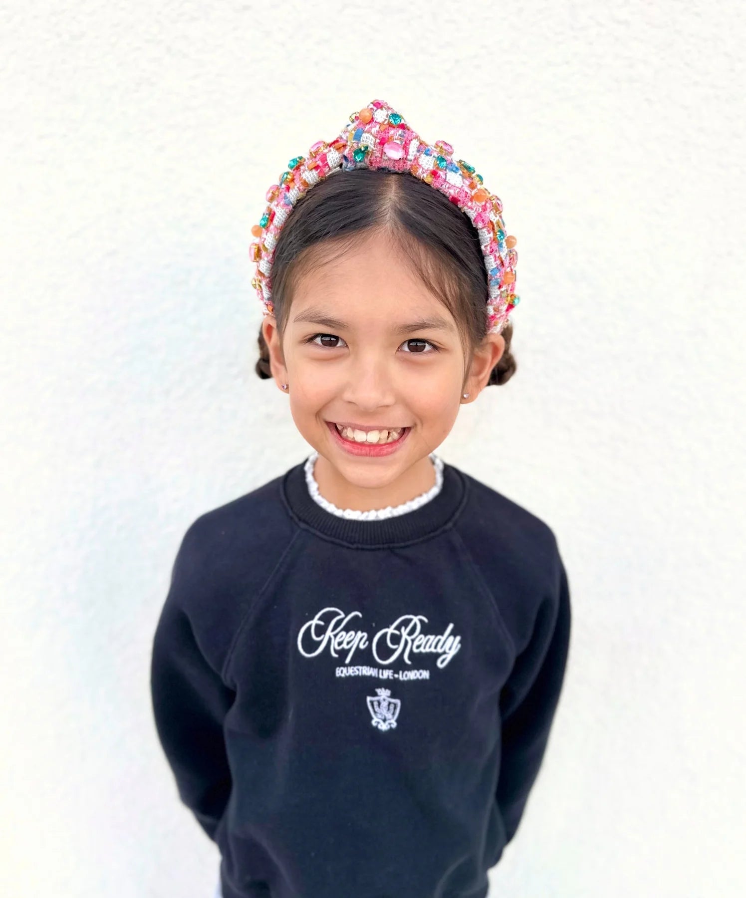 Colorful bubblegum tweed headband with multicolor crystals. Gold plated BC trademark logo attached. Kid size and comfortable to wear everyday!