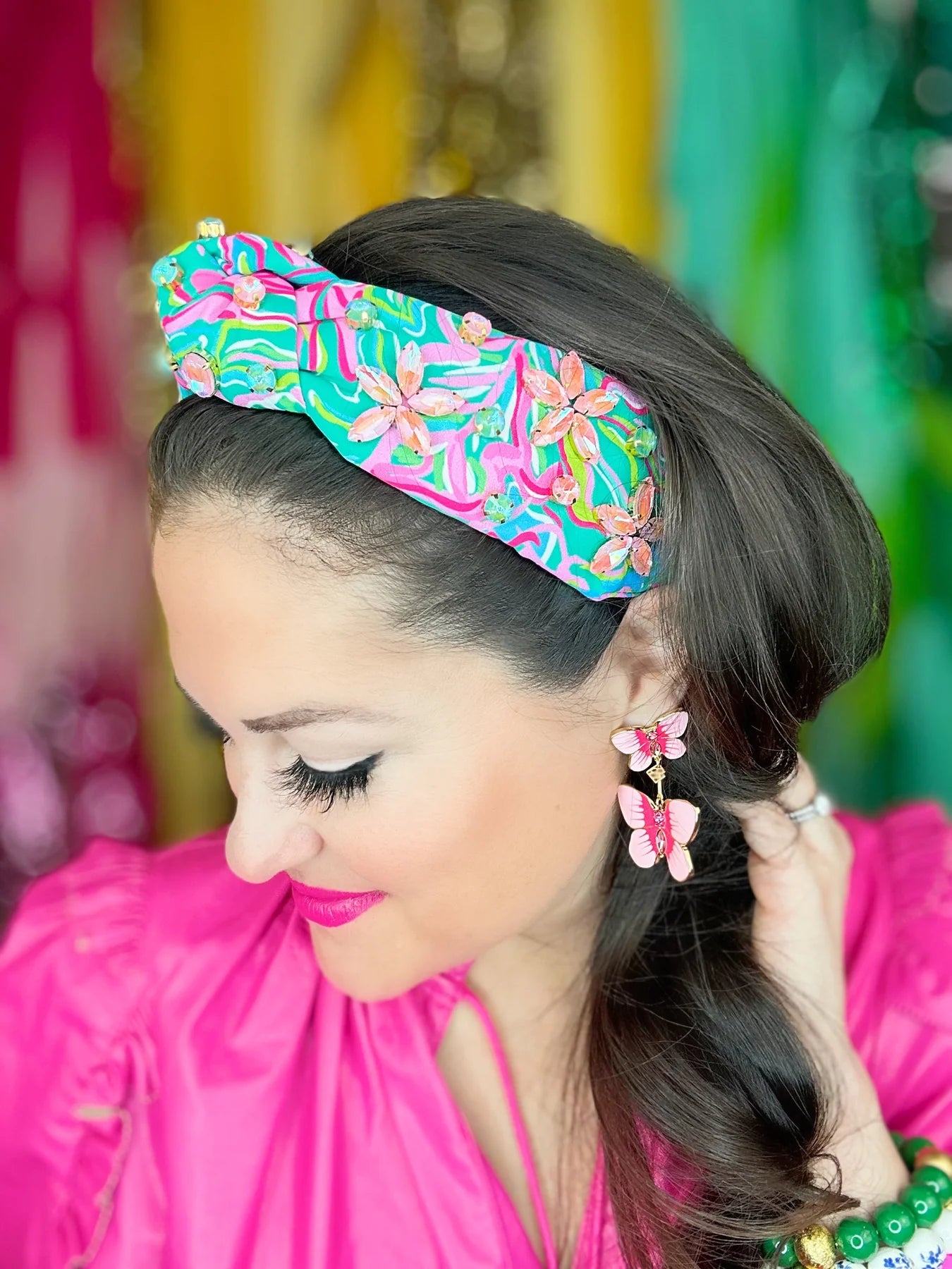 The most gorgeous and whimsical earrings that you ever did see, hand-painted pink butterfly dangle earrings with the highest attention to detail. Gold plated butterflies feature crystals set in the center and a BC trademark logo dangle, as well as BC Trademark logo embossing on the back side of the earrings. Measures 2.5" long and features hypoallergenic titanium post