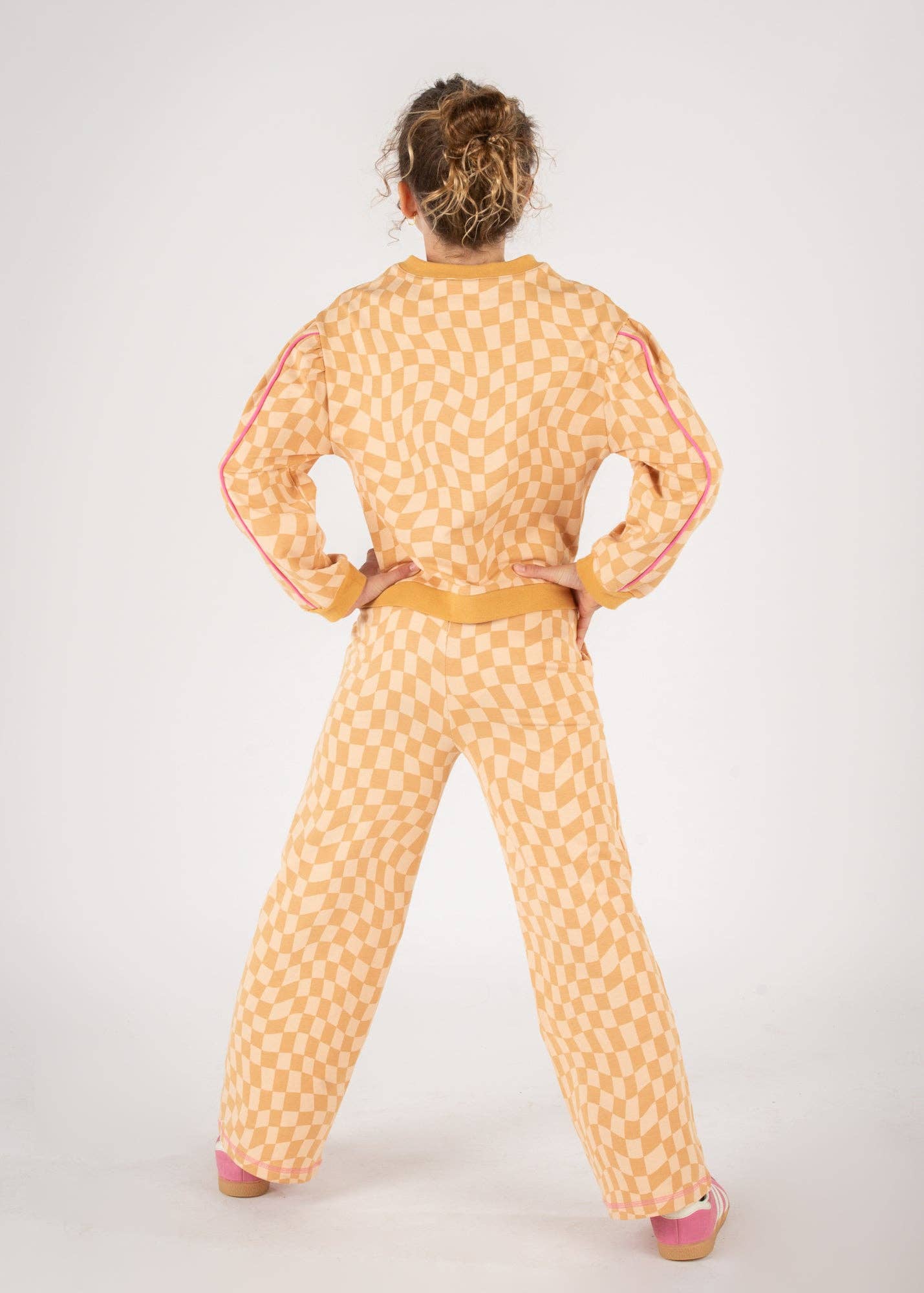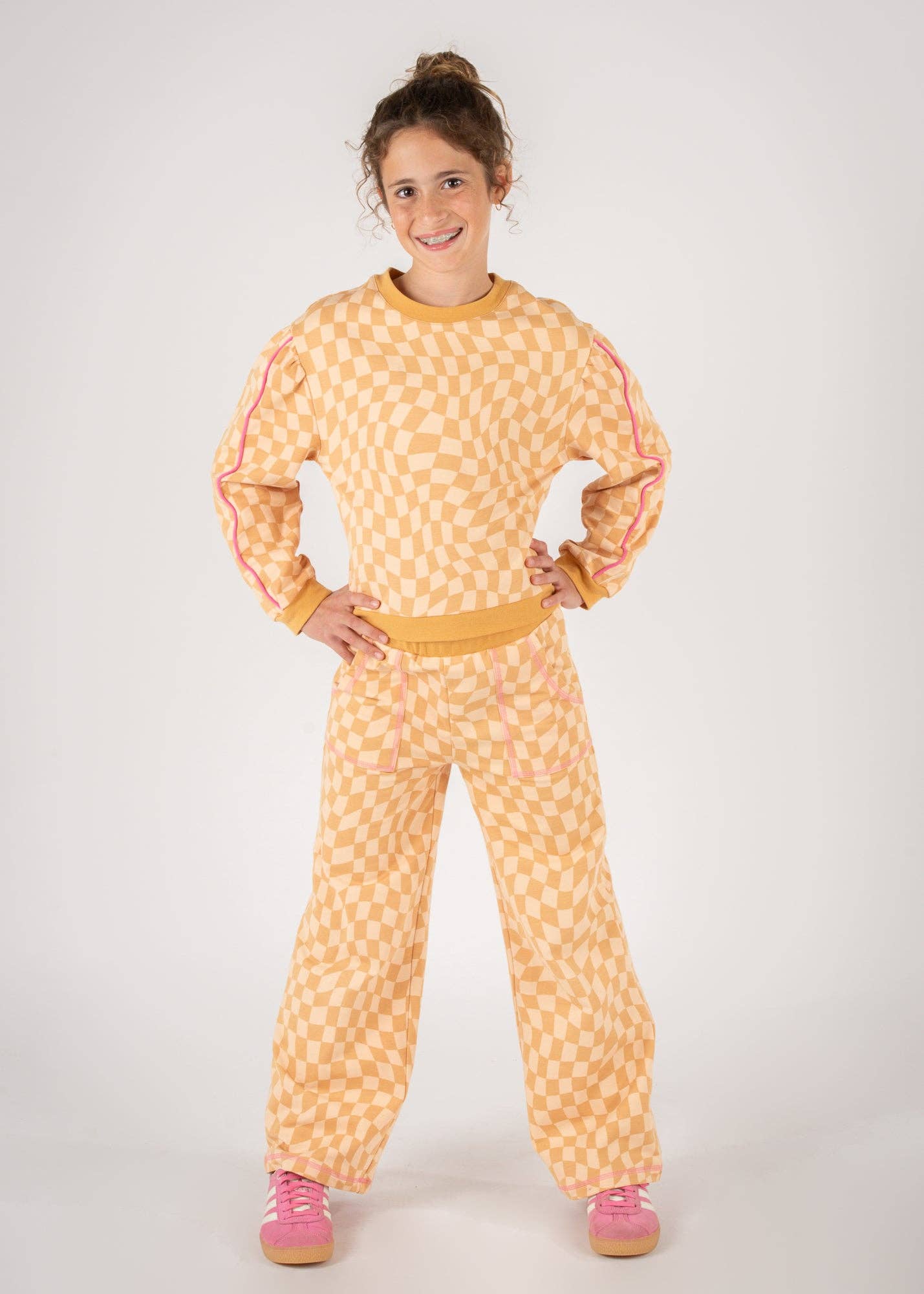 This Twisted Check Caramel Sweatshirt is a sweet, trendy treat for your growing girl. The lightweight French Terry fabric with a modern twisted check print is a perfect way to swirl into the season. Add the Twisted Check Sweatpants for a head-to-toe look that’s comfy and cool as can be.