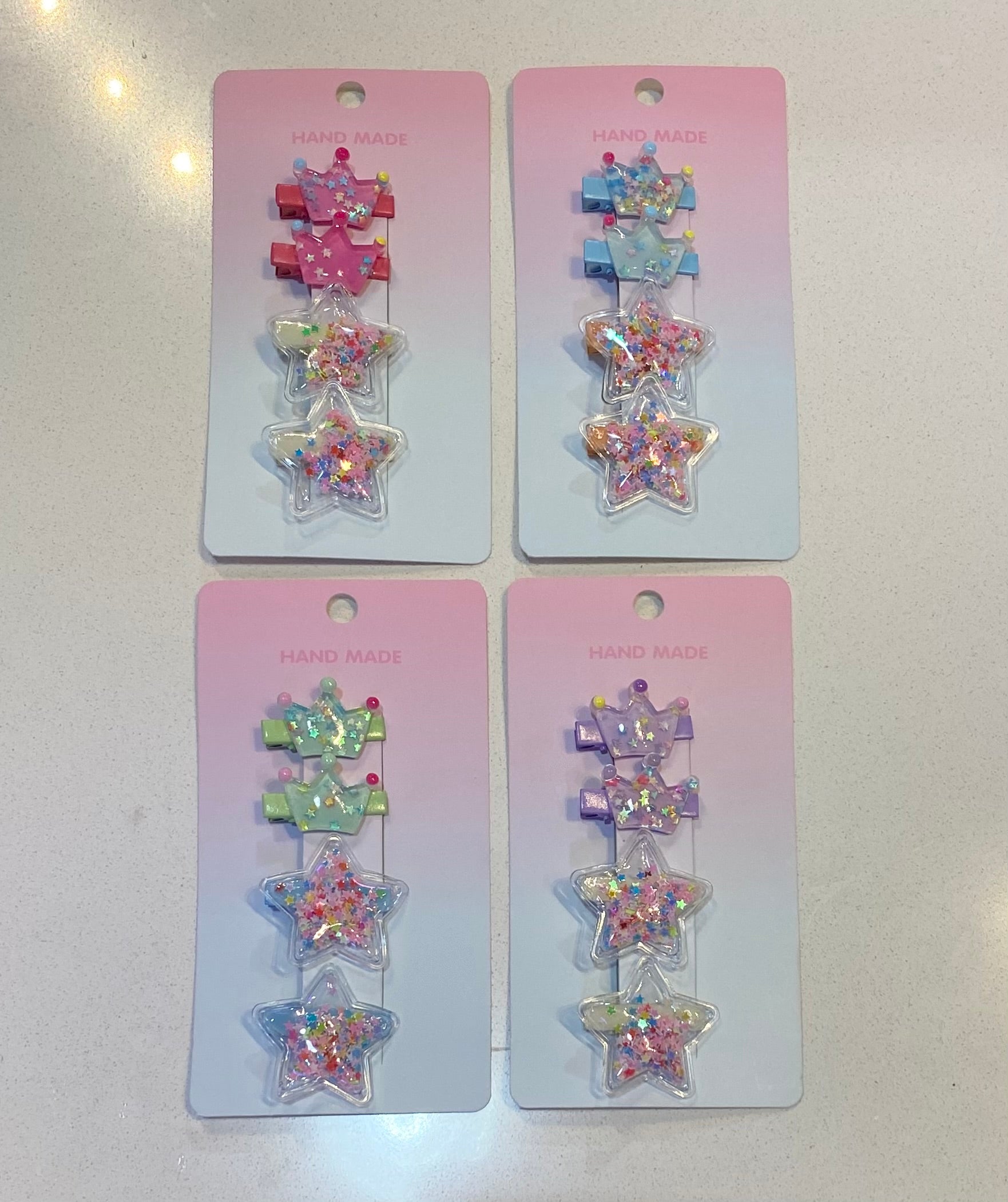 These hair clip sets are sweet and colorful! Includes a pair of clear acrylic crowns with colorful stars and another set of shaker star clips! A great hair combo!