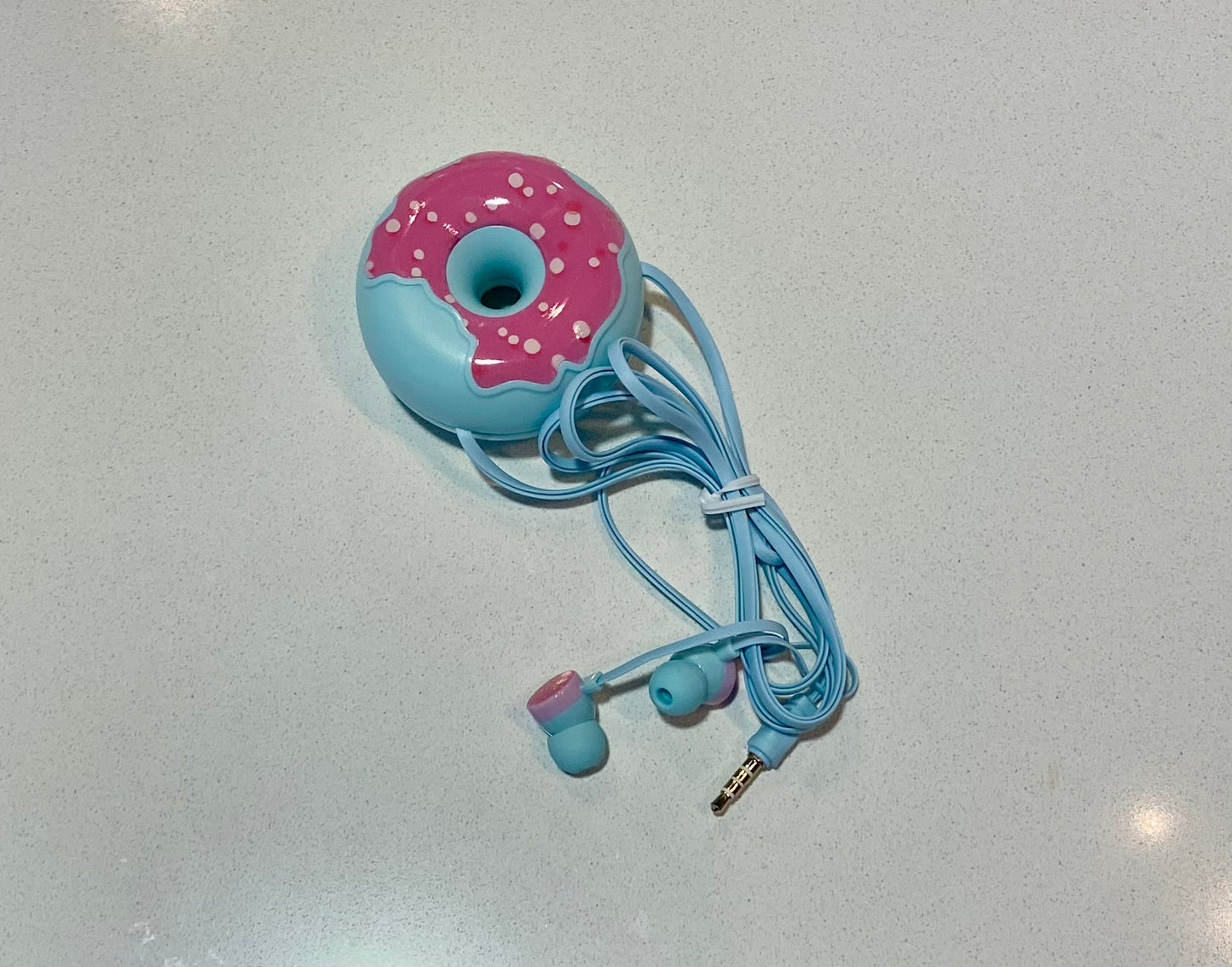 These adorable donut wired earbuds are tangle-free with sound isolating with a mic. Comes in a cute donut storage case.