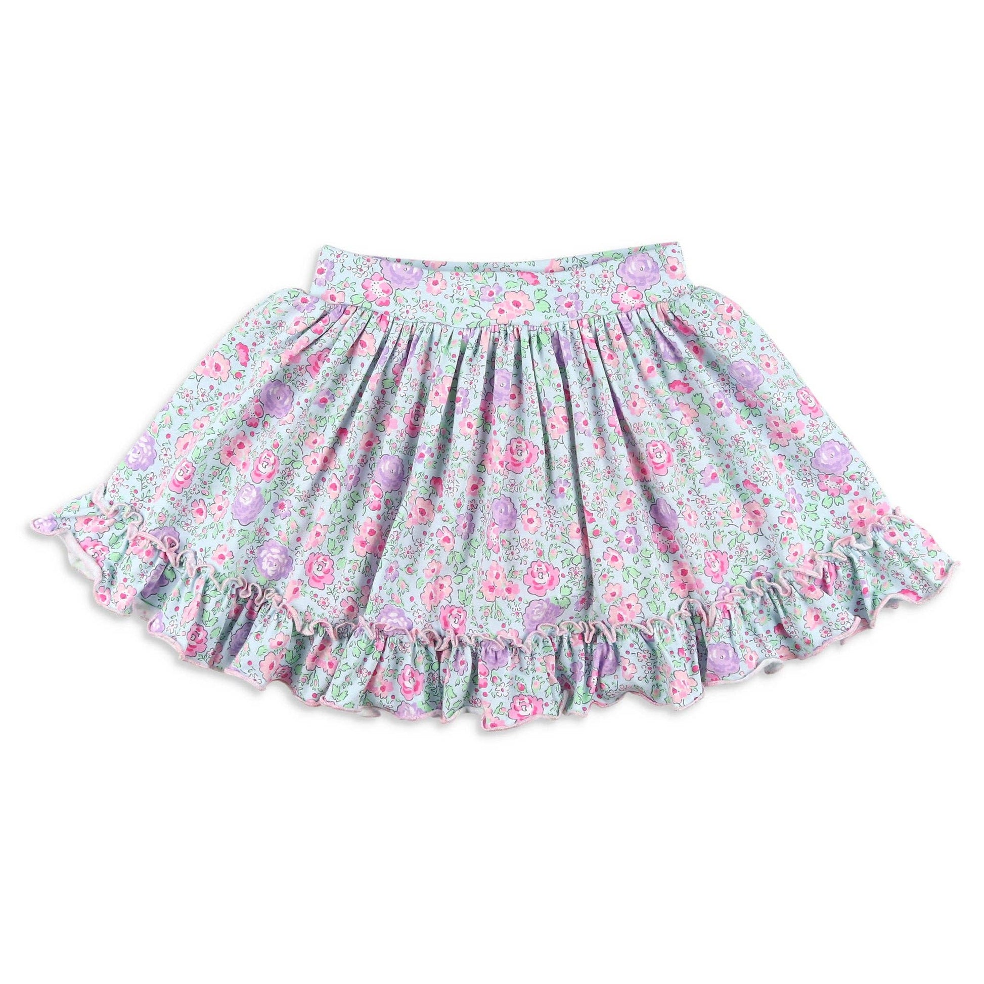 This whimsical and vintage, sweet Girls Flowy Skort-Posy Petals from Serendipity should become a delightful favorite! This playful skort features soft, cotton knit fabric in a pink, green, purple, and white floral print on pale green knit fabric, with pink serge trim along the bottom skirt ruffle, elastic at the waist, a sweet flowy skirt, and under skort pink pants for that added comfort, all creating a sporty picture!
