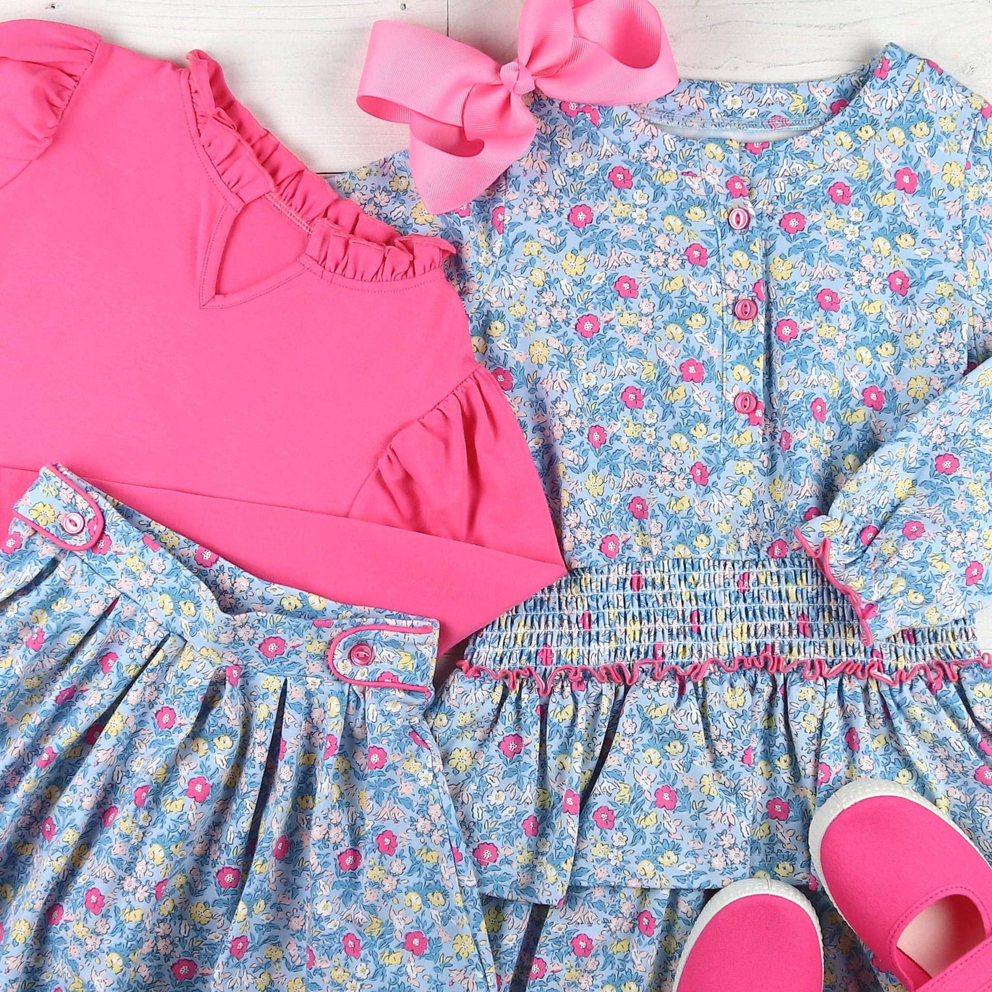 There's nothing like a happy and cheerful wildflower print to liven up a fall or winter day! And this whimsical and vintage, sweet Girls Smocked Waist Dress in Wildflower print from Serendipity should become a delightful favorite! This playful dress features soft, cotton knit fabric in a pink, blue, white, and yellow floral print on light blue, with sweet smocking at the waist, a raspberry pink serge trim ruffle, and custom pink buttons up the front, all creating a quaint picture! The fun tier overlay skirt, just makes this dress even more special. Such a versatile dress. She will be so ready for all fun activities, and for enjoying the fall and winter weather!