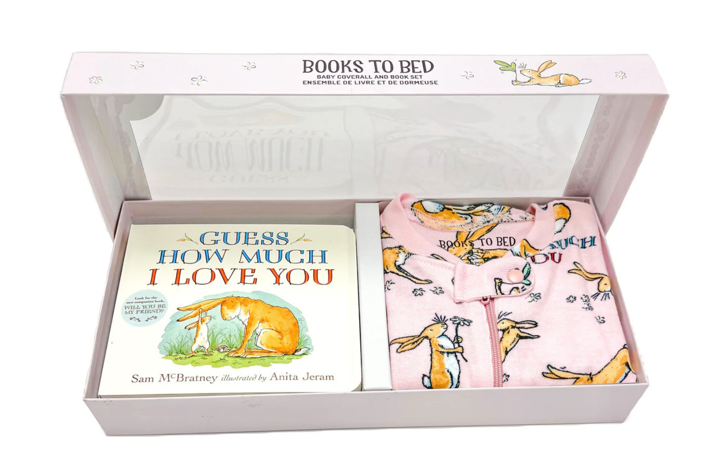 "I love you right up to the moon and back!" A gift set including the board book "Guess How Much I Love You" with the sweetest matching sleeper pajamas.