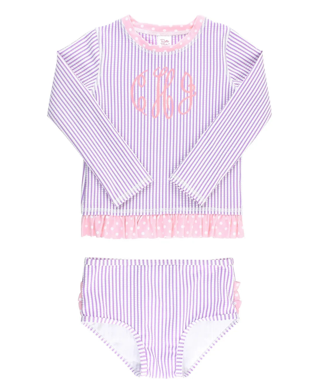 Little girls just look so adorable in seersucker! This sweet long sleeve girls' rash guard and bikini set is the go-to suit for vacations and trips to the beach. The full coverage style and UPF 50+ fabric will keep her safe from the sun's harmful rays. Add a personalized and traditional touch with a monogram! *Ruffle hem layers slightly over the waist of the swim bottoms for extra coverage.