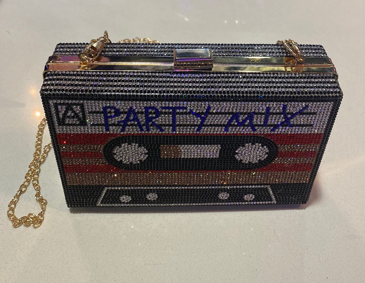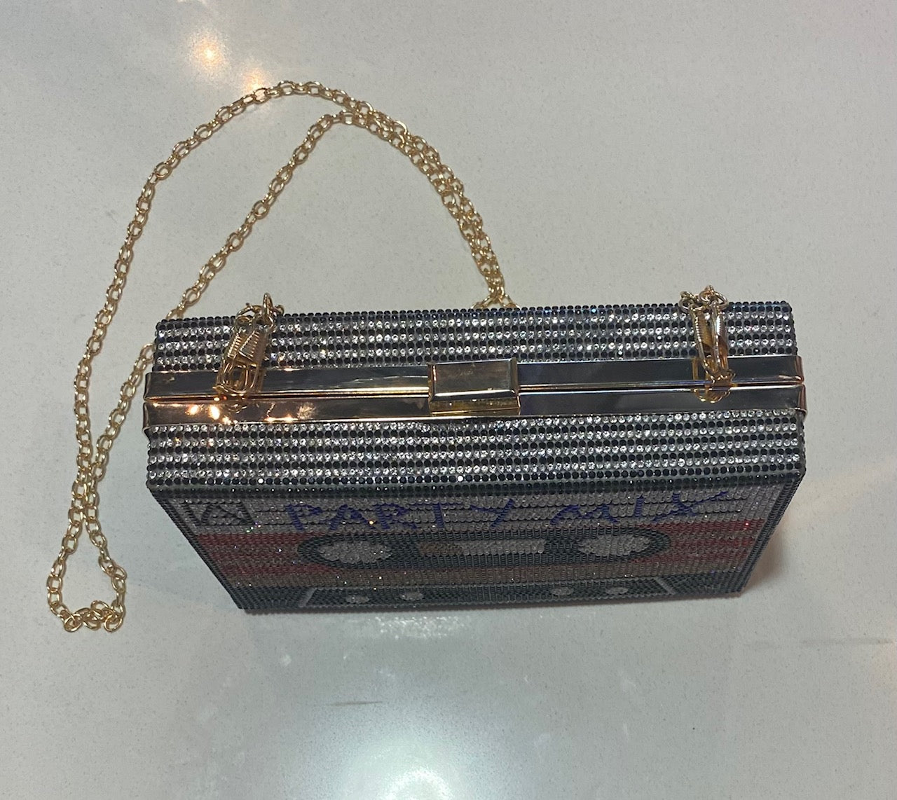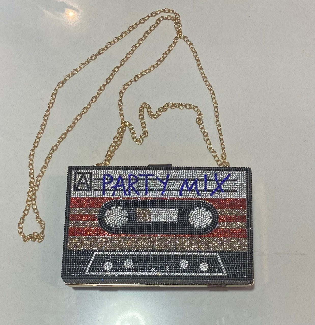 This fabulous clutch purse is completely covered in rhinestones to look like a party mix cassette tape. Approx. 7x4x2. Includes two gold link chain straps, one long and the other shorter and top lock. You'll be the hit of any party with this accessory!