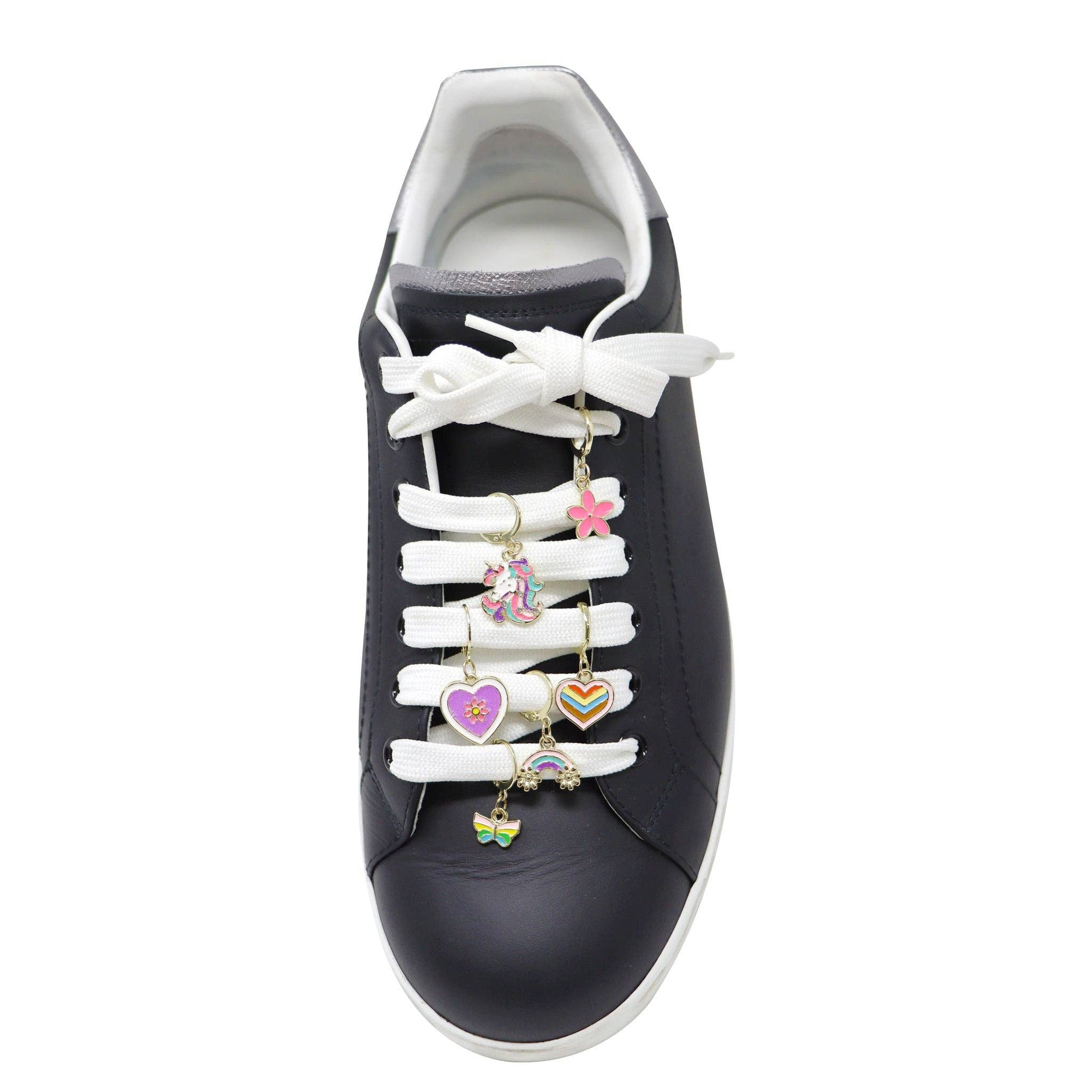 These Rainbow Unicorn 6-pack Charm Set features 6 beautifully crafted, gold plated unique charms including a unicorn, rainbow, butterfly, flower, and 2 heart styles. Designed to easily attach to your necklace, bags, or shoelaces, you will be showcasing your individual style in seconds.