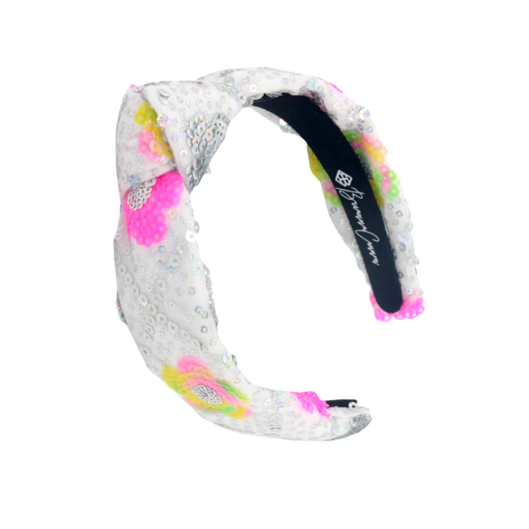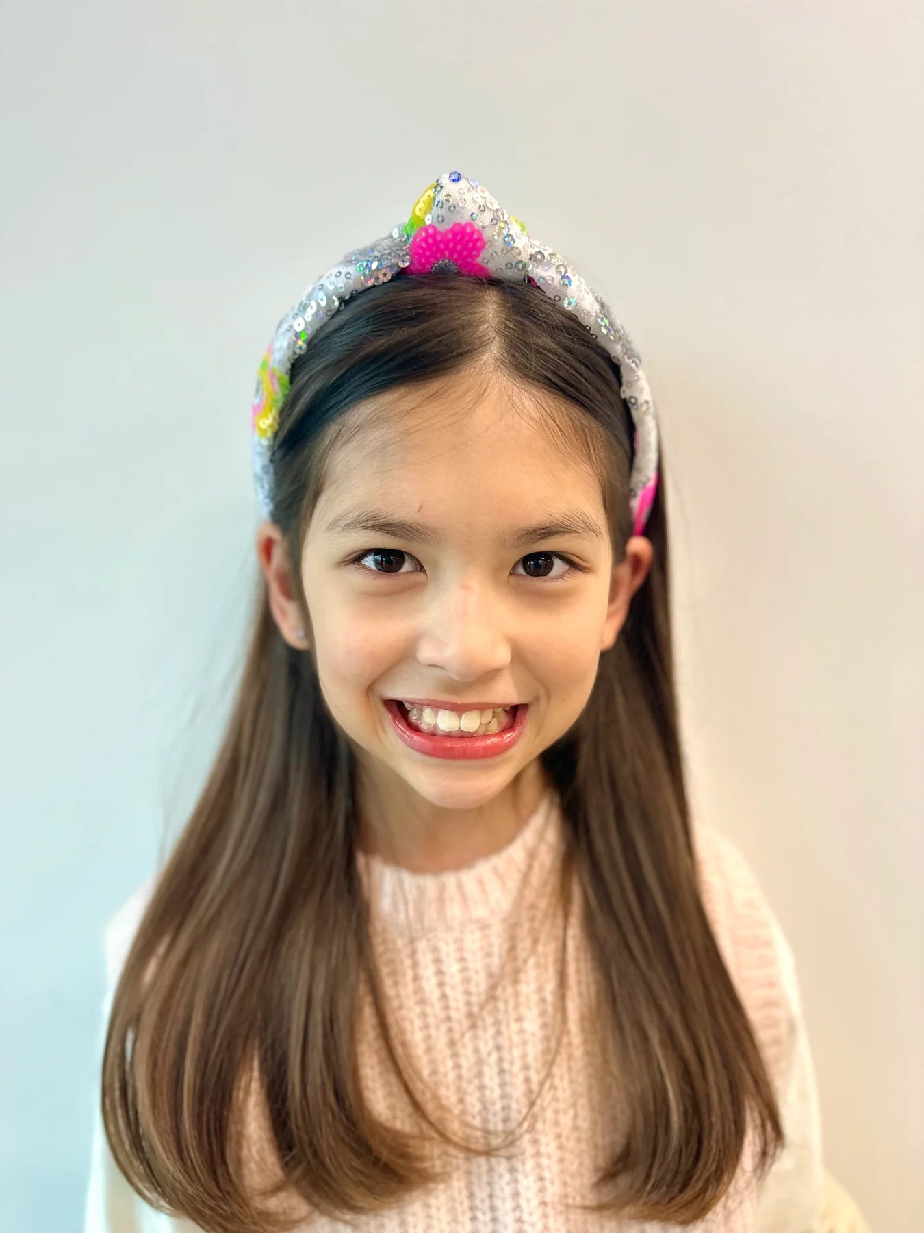 Gorgeous sequins and bright flowers. Gold plated BC trademark logo attached. Child size and comfortable to wear everyday!