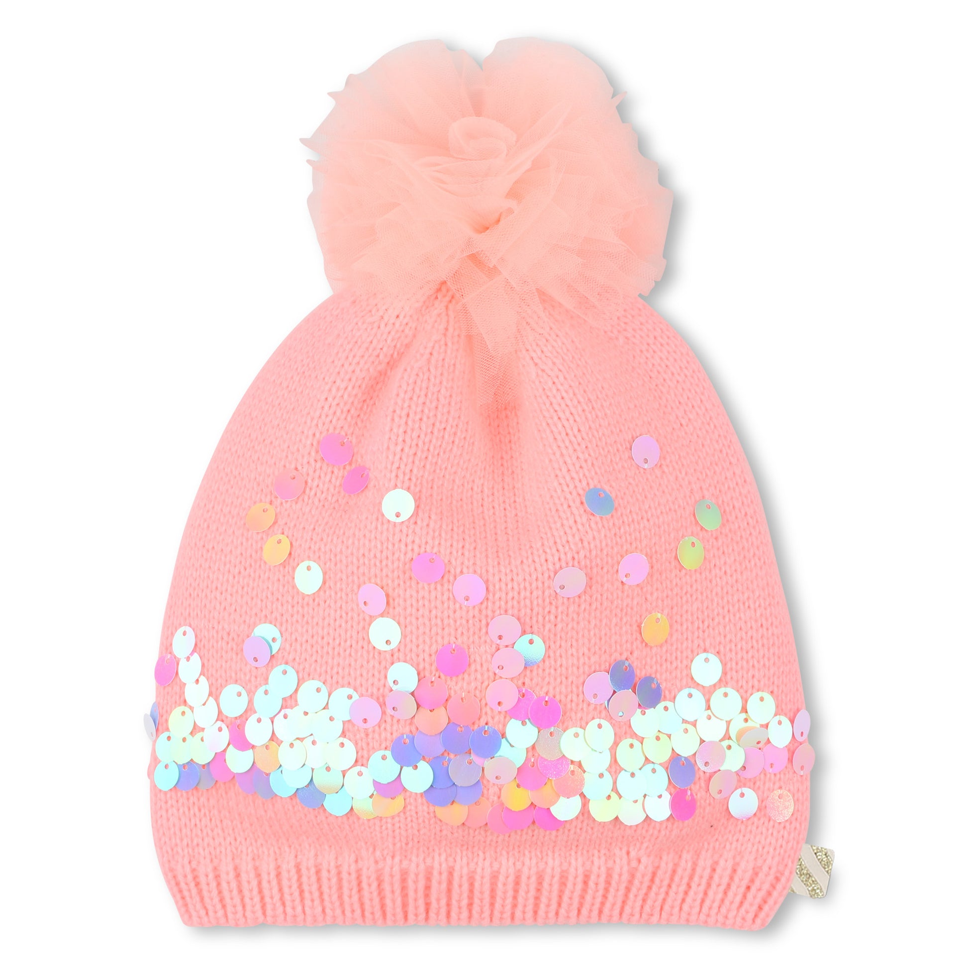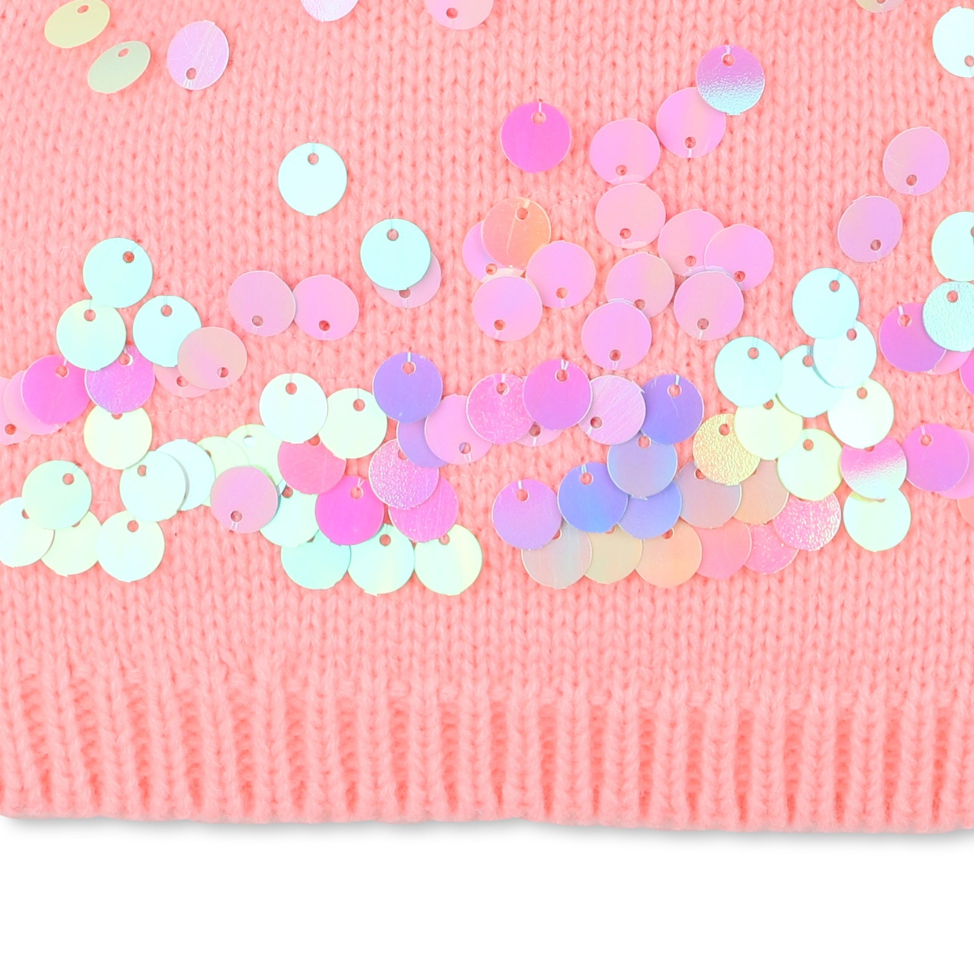 This Billieblush peach hat with ribbed hem and tulle pompom is embellished with sequins on the front and on the back. So fashionable!