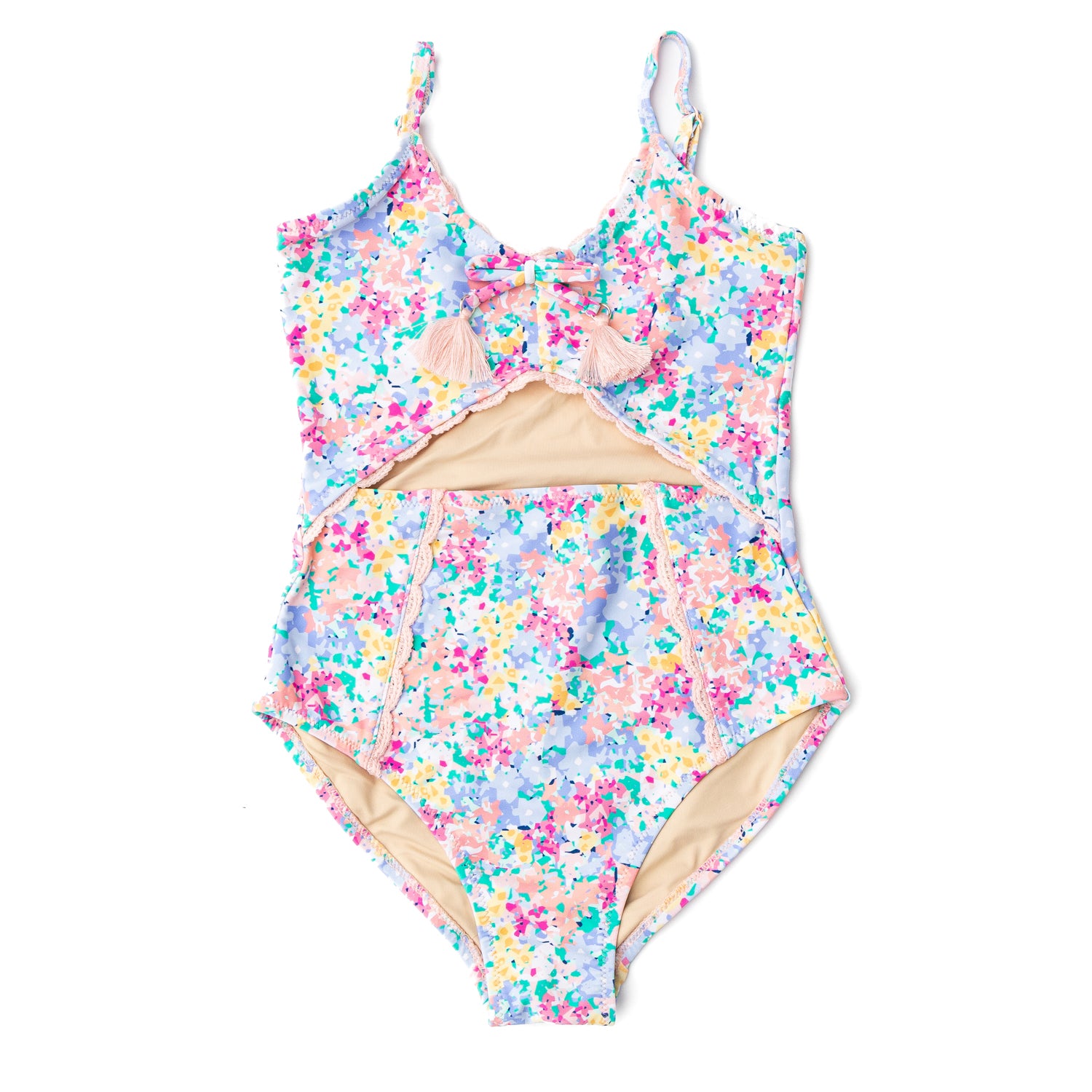 Make a splash this summer with the Spring Blooms Girls Monokini One Piece Swimsuit, where fun design meets practical comfort. This stylish swimsuit features trendy cutout detailing, adding a modern touch to her beach or poolside look. The adjustable straps ensure a snug, personalized fit, while the full cut coverage keeps her comfortable and confident throughout all her adventures.