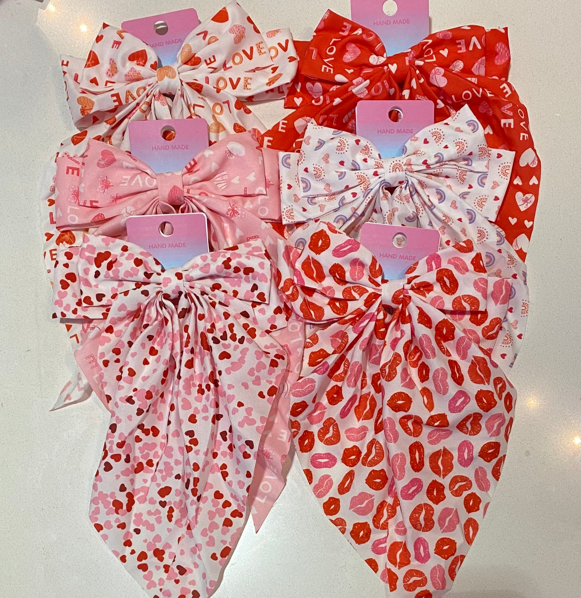 These long Valentine silk hair bows come in a variety of prints! She'll be sweet for the season! Each sold separately.
